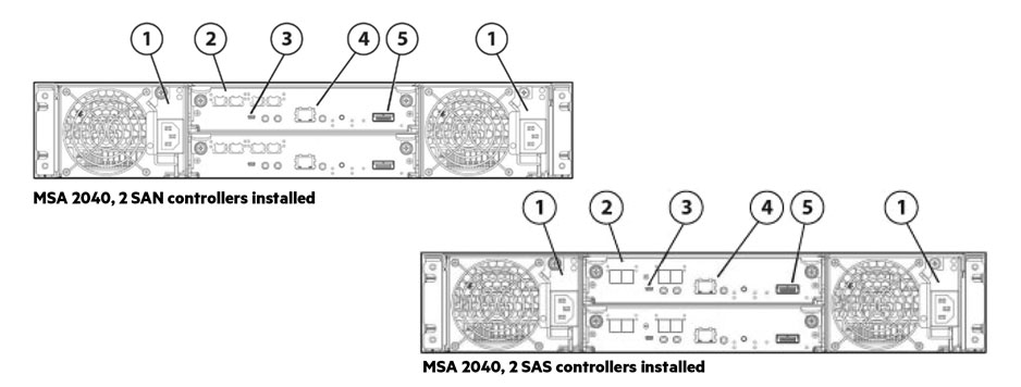 | MSA 2040, 2 SAN controllers installed 1. Power supplies 2. 8 and/or 16Gb Fibre Channel, 1 and/or 10GbE iSCSI 3. CLI port (mini-USB) 4. Management Ethernet port 5. Expansion port | MSA 2040, 2 SAS controllers installed 1. Power supplies 2. 6Gb/12Gb mini-SAS HD ports 3. CLI port (mini-USB) 4. Management Ethernet port 5. Expansion port |