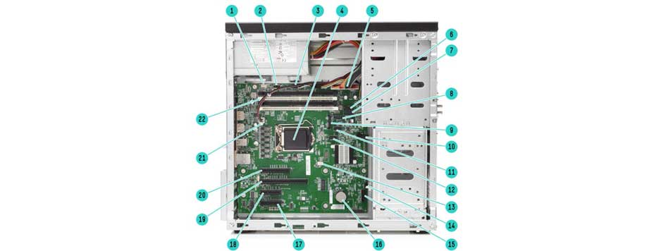 | Front View: 1 Media Bay 2 Hard drive bays NOTE: To install HDD, must: a. Power down the server. b. Remove all power. c. Disconnect each power cord from the power source. d. Remove the access panel. e. Remove the tower bezel. f. Remove the EMI shield. 3 USB 2.0 connectors 4 Drive cage NOTE: To install HDD, must: a. Power down the server. b. Remove all power. c. Disconnect each power cord from the power source. d. Remove the access panel. e. Remove the tower bezel. f. Remove the EMI shield. 5 Ambient temperature sensor Rear View: 1 Power Supply 2 Kensington security slot 3 Slot 1, PCIe3 x 8 (8,4,1) NOTE: For more information on the expansion slot specifications, see PCIe expansion slot definitions. 4 Slot 2, PCIe3 x 16 (16, 8, 4, 1) NOTE: For more information on the expansion slot specifications, see PCIe expansion slot definitions. 5 Slot 3, PCIe3 x 4 (4,1) NOTE: For more information on the expansion slot specifications, see PCIe expansion slot definitions. 6 Slot 4, PCIe3 x 4 (1) NOTE: For more information on the expansion slot specifications, see PCIe expansion slot definitions. 7 NIC connector 8 USB 3.0 connector 9 Display ports Internal View:1 System fan connector 2 Internal USB 2.0 connector 3 Front LEDs and power button module connector 4 Processor 5 24-pin power supply connector 6 SATA connector 1 7 SATA connector 2 8 SATA connector 3 9 Optical drive connector 10 Front USB connector 11 SATA connector 4 12 SATA connector 5 13 Heatsink fan connector 14 Ambient temperature sensor connector 15 TPM connector 16 System battery 17 Slot 4, PCIe3 x 4 (1) NOTE: For more information on the expansion slot specifications, see PCIe expansion slot definitions. 18 Slot 3, PCIe3 x 4 (4,1) NOTE: For more information on the expansion slot specifications, see PCIe expansion slot definitions. 19 Slot 2, PCIe3 x 16 (16,8,4,1) NOTE: For more information on the expansion slot specifications, see PCIe expansion slot definitions. 20 Slot 1, PCIe3 x 8 (8,4,1) NOTE: For more information on the expansion slot specifications, see PCIe expansion slot definitions. 21 4-pin power connector 22 DIMM slots Standard Features Processor Model CPU frequency Core L3 Cache Power DDR4 Hz G4400 3.3GHz 2 3MB 54W 2133 E3-1225v5 3.3GHz 4 8MB 80W 2133 Chipset Intel® C236 Chipset Upgradeability Up to 6LFF Non-hot plug SATA 3.5″ drives NOTE: HPE ML10 Gen9 HDD Cable Screw Kit (#841425-B21) is required if install the 5th drive. If the 6th drive is required, must purchase HPE ML10 Drive Enablement Kit (#836739-B21). Optical Drive Bay NOTE: When install ODDe, HDD can support up to 5 drives. NOTE: To install ODD, must purchase HPE ML10 Gen9 Slim ODD Enablement Kit (#836742- B21). On System Management Processor Intel® Active Management Technology (Intel® AMT 11.0) NOTE: The server supports the Intel Standard Manageability when the Intel Pentium or Core i3 processor is installed. The server supports Intel AMT when the Intel Xeon processor is installed in the system. Memory Type DDR4 Unbuffered (UDIMM) DIMM Slots Available 4 4 DIMMs (2 Channels/ 2 DIMMs per channel) Maximum Capacity (UDIMM) 64GB (4 x 16GB UDIMM @2133MHz) NOTE: For information regarding HPE Server Memory Network Controller Intel® Ethernet Connection I219-LM Maximum Internal Storage CAPACITY CONFIGURATION Non Hot Plug LFF SATA 24TB 6 x 4TB |